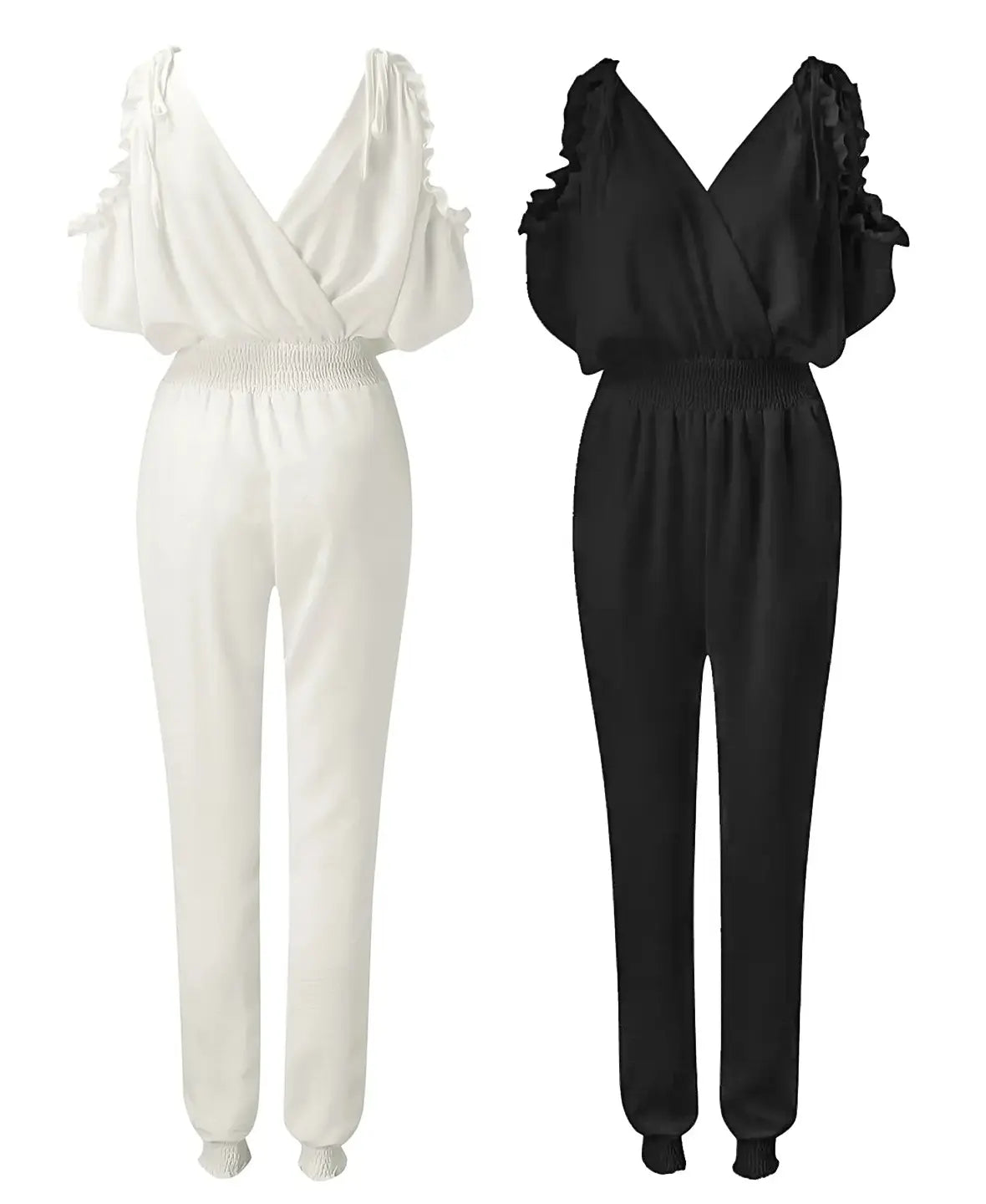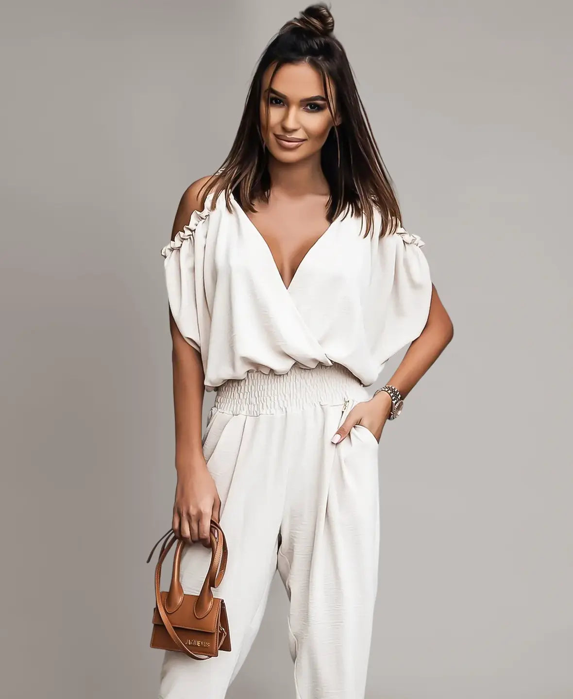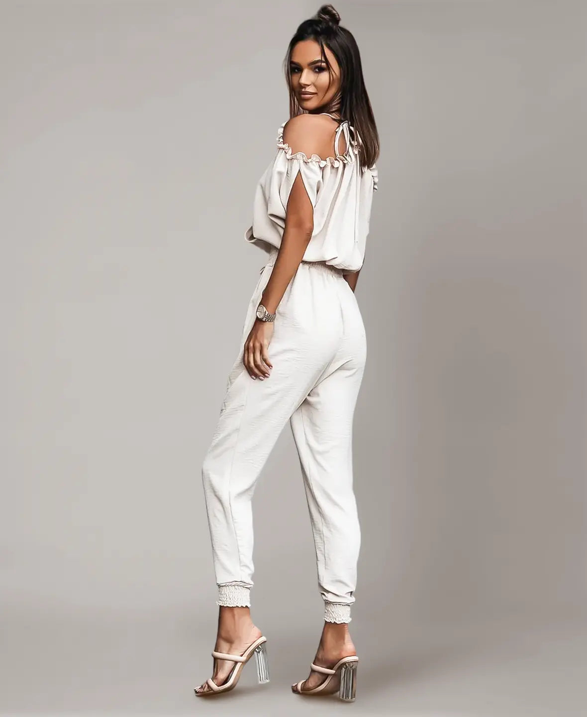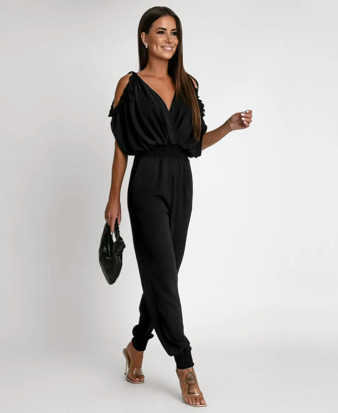 Refined, magnetic, and designed to empower, the 'Celeste Cut-Out Shoulder Jumpsuit' was crafted for moments that leave a mark. With a fluid silhouette, elevated wrap neckline, and cinched waist, it channels timeless elegance with a bold edge.